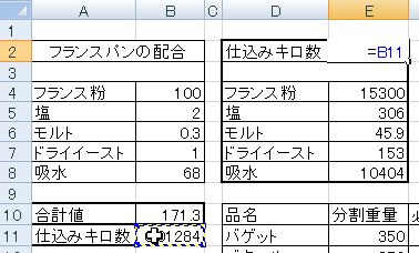 総生地重量(10300g)÷(合計値×10)=仕込みキロ数なので、下のように計算式を打ち込みます。
